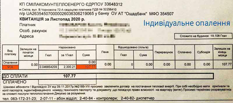 Так виглядали квитанції у 2020 році на оплату за спожите тепло для власників квартир з центральним та індивідуальним опаленням у конкретному випадку. Платіж власникам квартир розбито на два пункти: за опалення квартири та за опалення МЗК. Там же вказано фактичне споживання теплової енергії багатоквартирним будинком за місяць. Комунальне підприємство Смілакомунтеплоенерго посилається на Закон України "Про житлово-комунальні послуги".